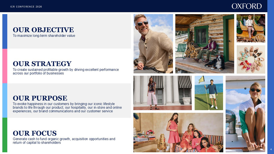 ICR CONFERENCE 2026 3 NYSE: OXM Cautionary Statement This presentation was prepared as of January 12, 2026, and, except as otherwise provided herein, the information contained in th is presentation is as of January 12, 2026. Any subsequent distribution, dissemination or reproduction of this presentation or any of its content is not an affirmation or restatement of any forward - looking statements contained herein. Forward - Looking Statements This presentation includes statements that constitute forward - looking statements. Such statements are subject to a number of risks, uncertainties and assumptions which could cause actual results to differ materially from those anticipated o r p rojected, including, without limitation, those identified under Part I, Item 1A. Risk Factors contained in our Annual Report on Form 10 - K for the per iod ended February 1, 2025 as updated by Part II, Item 1A. Risk Factors in our Quarterly Report on Form 10 - Q for the First Quarter of Fiscal 2025 ende d May 3, 2025 under the heading “Risk Factors,” those described from time to time in subsequent reports filed with the SEC and those identi fie d in our press release dated December 10, 2025 under the caption, “Safe Harbor”, all of which are available under the Investor Relations tab of our website at oxfordinc.com. New risks and uncertainties emerge from time to time, and it is not possible for us to predict all risks and unce rtainties that could impact the forward - looking statements contained in this presentation. You should not place undue reliance on forward - looking st atements, which speak only as of the date they are made. We disclaim any intention, obligation or duty to update or revise any forward - looking statements, whether as a result of new information, future events or otherwise, except as required by law.