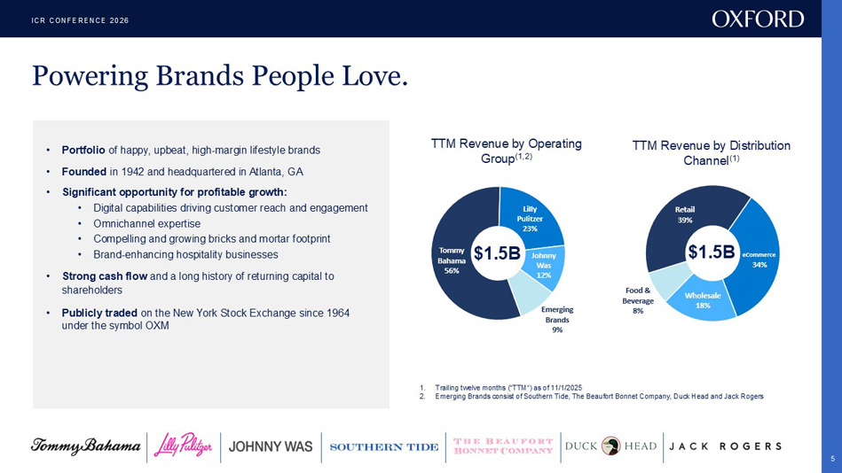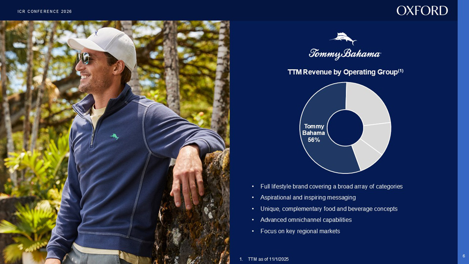 ICR CONFERENCE 2026 5 • Portfolio of happy, upbeat, high - margin lifestyle brands • Founded in 1942 and headquartered in Atlanta, GA • Significant opportunity for profitable growth: • Digital capabilities driving customer reach and engagement • Omnichannel expertise • Compelling and growing bricks and mortar footprint • Brand - enhancing hospitality businesses • Strong cash flow and a long history of returning capital to shareholders • Publicly traded on the New York Stock Exchange since 1964 under the symbol OXM Powering Brands People Love. TTM Revenue by Operating Group (1,2) TTM Revenue by Distribution Channel (1) 1. Trailing twelve months (“ TTM “) as of 11/ 1 /202 5 2. Emerging Brands consist of Southern Tide, The Beaufort Bonnet Company, Duck Head and Jack Rogers $1.5B dŽŵŵLJ ĂŚĂŵĂ ϱϲ й >ŝůůLJ WƵůŝƚnjĞƌ Ϯϯ й :ŽŚŶŶLJ tĂƐ ϭϮ й ŵĞƌŐŝŶŐ ƌĂŶĚƐ ϵ й $1.5B