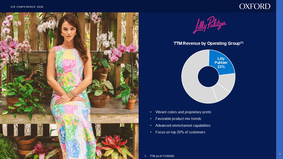 ICR CONFERENCE 2026 6 • Full lifestyle brand covering a broad array of categories • Aspirational and inspiring messaging • Unique, complementary food and beverage concepts • Advanced omnichannel capabilities • Focus on key regional markets TTM Revenue by Operating Group (1) 1. TTM as of 11/ 1 /202 5 Tommy Bahama 56%
