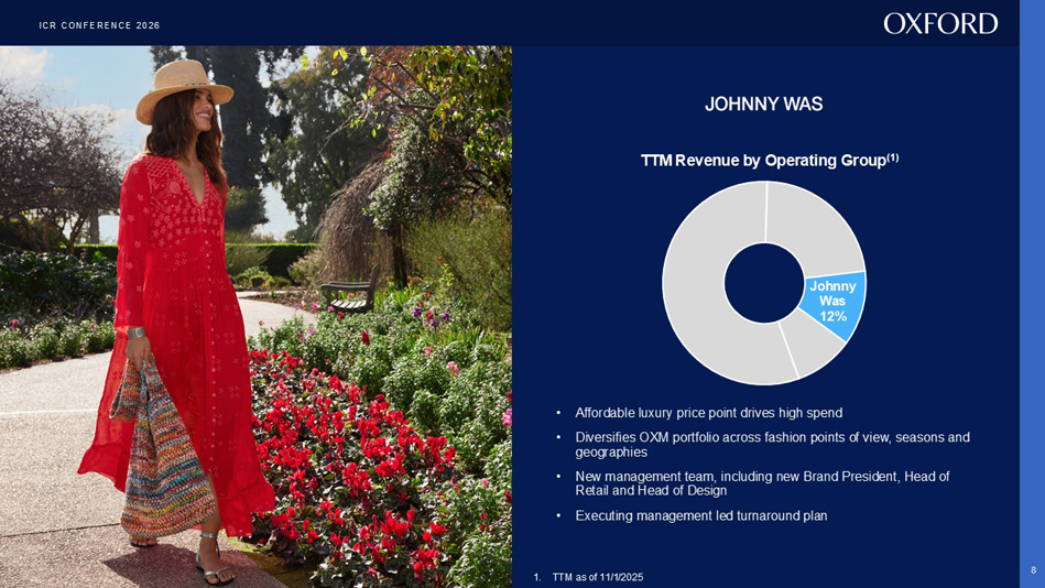 ICR CONFERENCE 2026 7 1. TTM as of 11/ 1 /202 5 • Vibrant colors and proprietary prints • Favorable product mix trends • Advanced omnichannel capabilities • Focus on top 20% of customers TTM Revenue by Operating Group (1) Lilly Pulitzer 23%