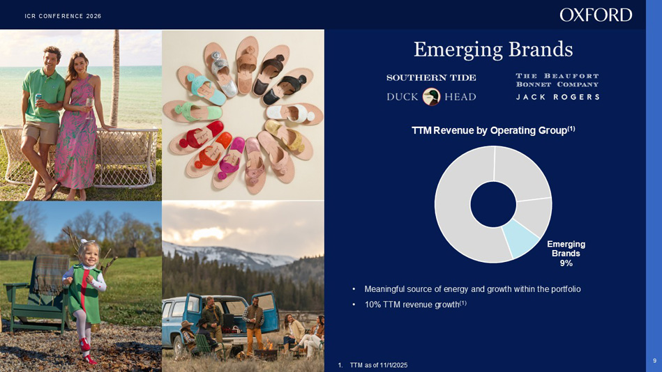 ICR CONFERENCE 2026 8 1. TTM as of 11/ 1 /202 5 • Affordable luxury price point drives high spend • Diversifies OXM portfolio across fashion points of view, seasons and geographies • New management team, including new Brand President, Head of Retail and Head of Design • Executing management led turnaround plan TTM Revenue by Operating Group (1) Johnny Was 12%