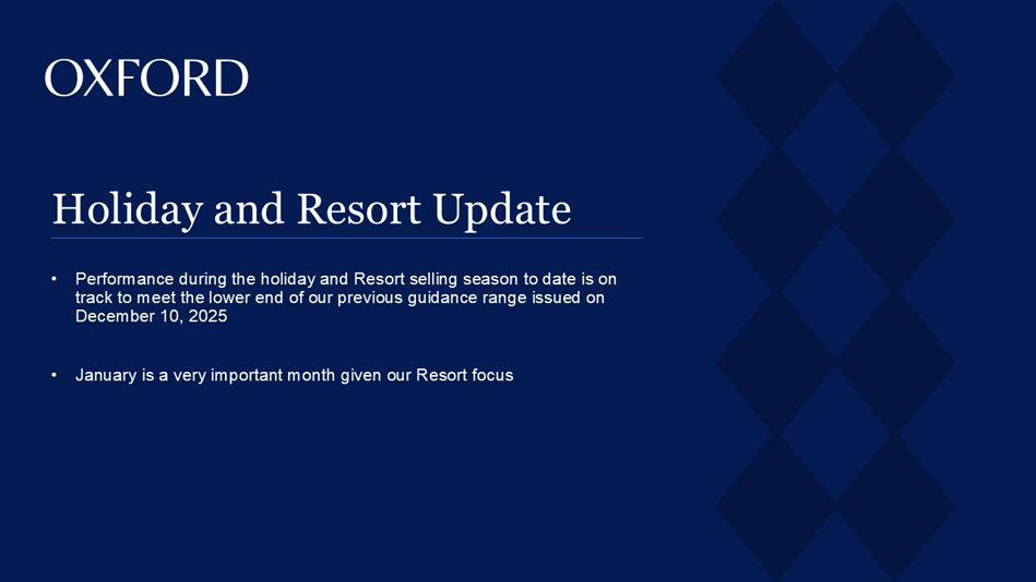 Holiday and Resort Update • Performance during the holiday and Resort selling season to date is on track to meet the lower end of our previous guidance range issued on December 10, 2025 • January is a very important month given our Resort focus