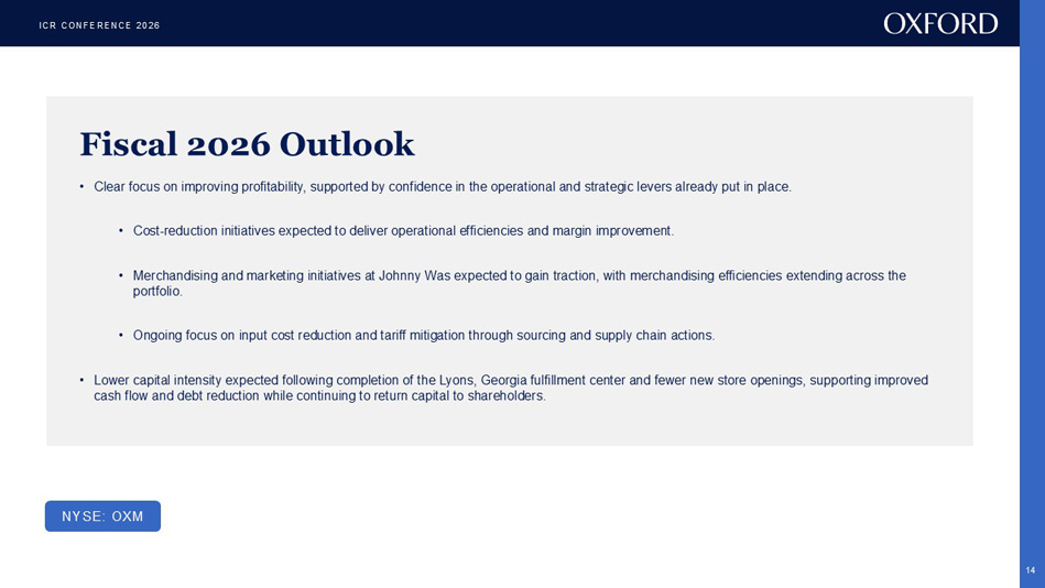 ICR CONFERENCE 2026 12 NYSE: OXM Fiscal 2025 Recap • Challenging consumer and promotional environment pressured traffic, conversion, and margins throughout the year. • Incremental U.S. tariffs represented a significant earnings headwind, driving approximately $25 million to $30 million of ant ici pated full - year additional costs and contributing to year - over - year gross margin contraction. • Mixed portfolio performance, with strength at Lilly Pulitzer and Emerging Brands offset by softness at Tommy Bahama and Johnn y W as. • Decisive actions to strengthen long - term fundamentals, including leadership and operational changes at Johnny Was, enhanced merc handising discipline, and ongoing cost and efficiency initiatives across the enterprise . • Continued long - term investment, including new store openings and significant progress on the Lyons, Georgia fulfillment center s et to go live early Fiscal 2026.